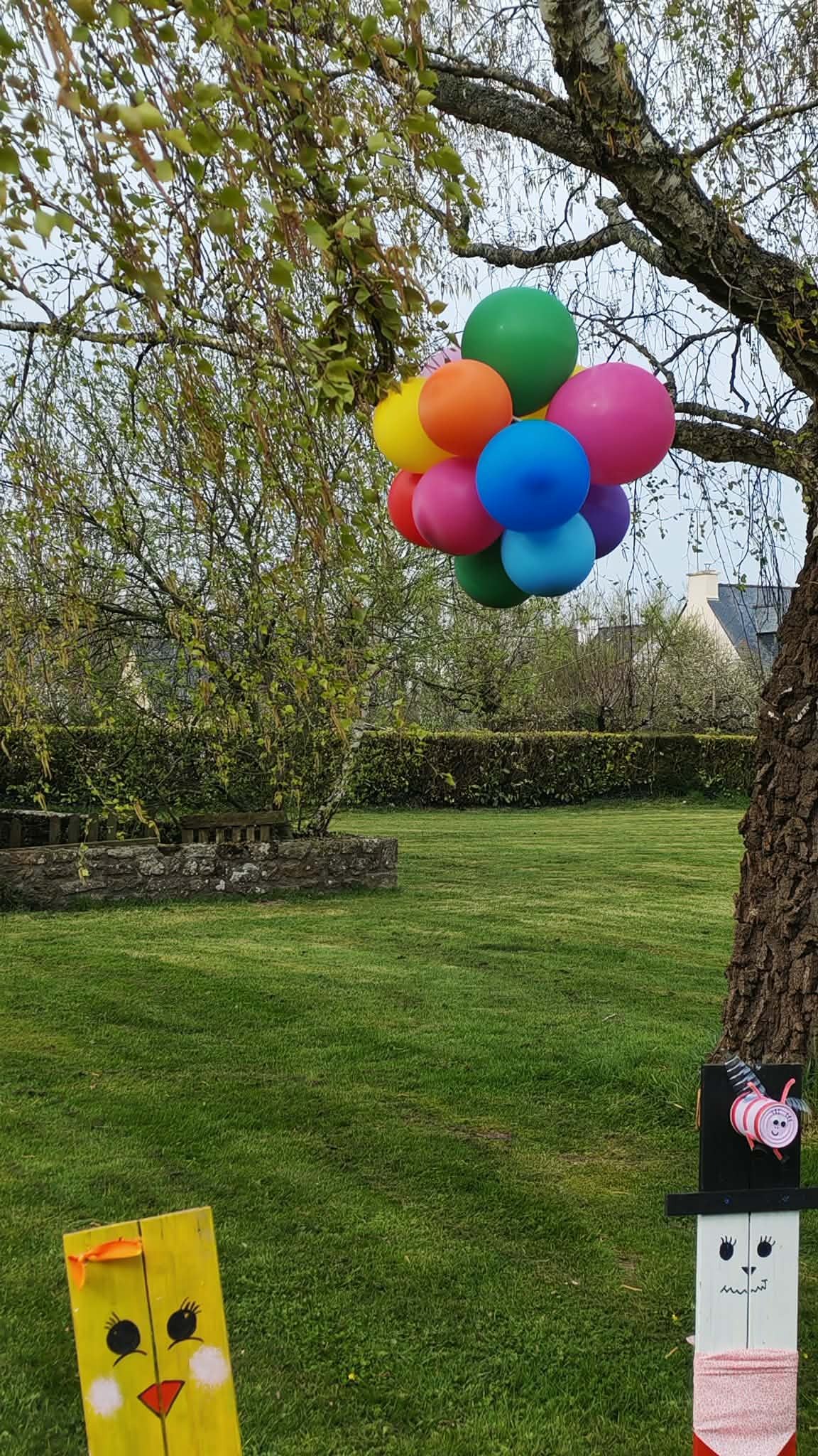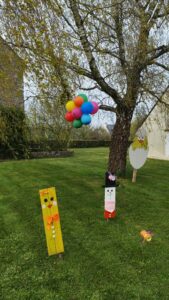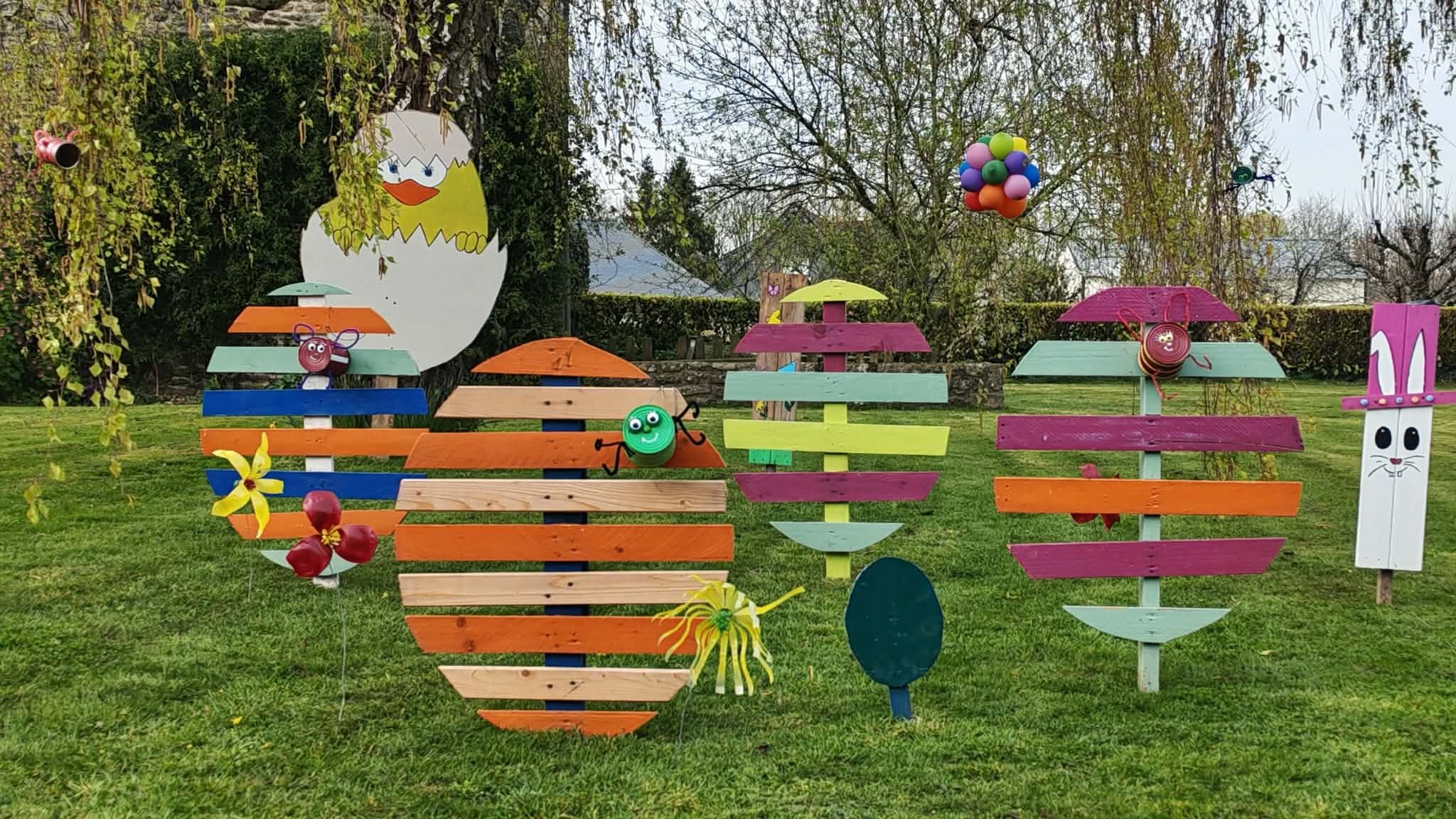 Des confections de fleurs colorées, d’oeufs décorés, de lapins malicieux, de ballons multicolores et d’abeilles colorées jonchent les pelouses devant la mairie.