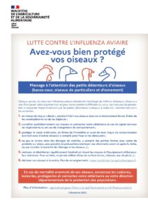 Il convient de renouveler l’information auprès des détenteurs de basse-cours d’une part sur leur obligation de claustration des volailles : mise en bâtiment fermé sur tout le périmètre de la commune et d’autre part sur leur obligation de recensement à l’aide du formulaire CERFA joint ou sur le site Mes Démarches: