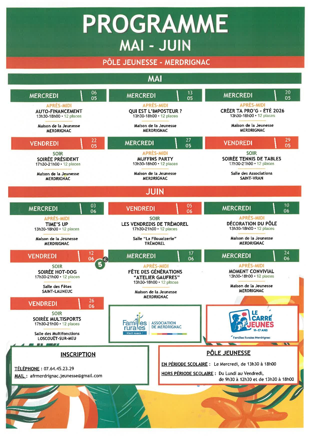 Inscription au 07 64 45 23 29 ou par mail : afrmerdrignac.jeunesse@gmail.com
