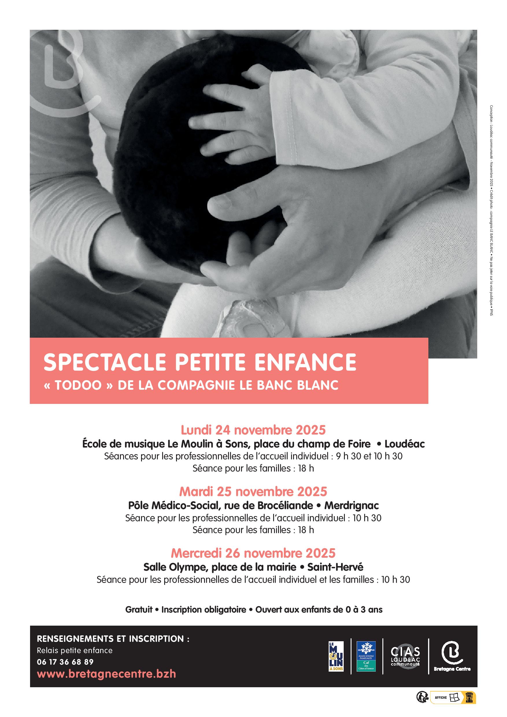 Le Relais petite enfance du CIAS de Loudéac communauté convie les professionnels de l’accueil individuel  les familles de jeunes enfants à venir découvrir le spectacle « Toodoo », véritable voyage multi-sensoriel de la compagnie « Le banc blanc ». Ce spectacle combine le chant, le mouvement, les arts visuels (y compris les matières textiles) et captive les tout-petits.